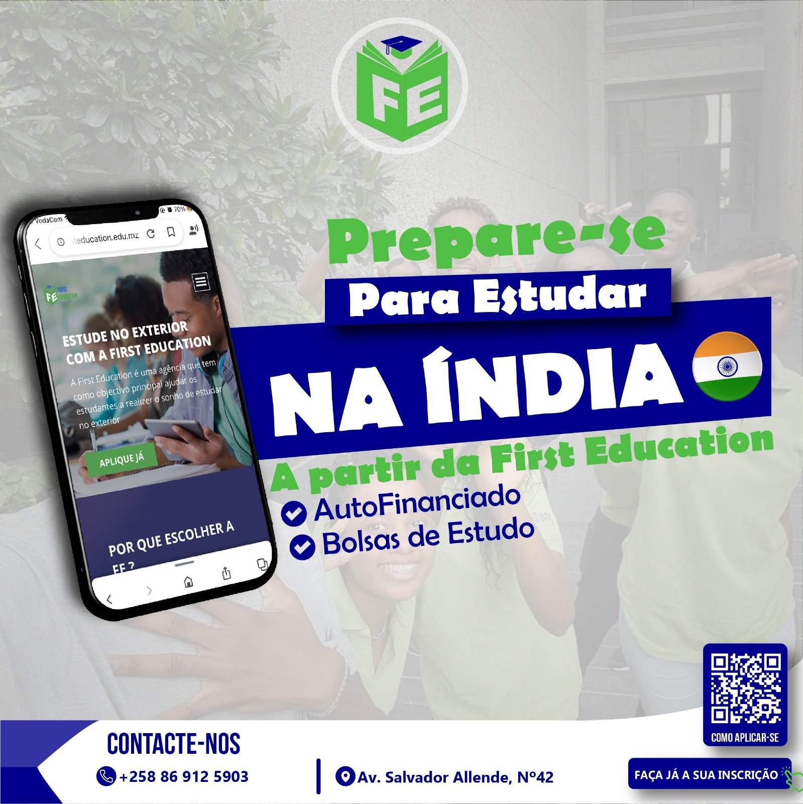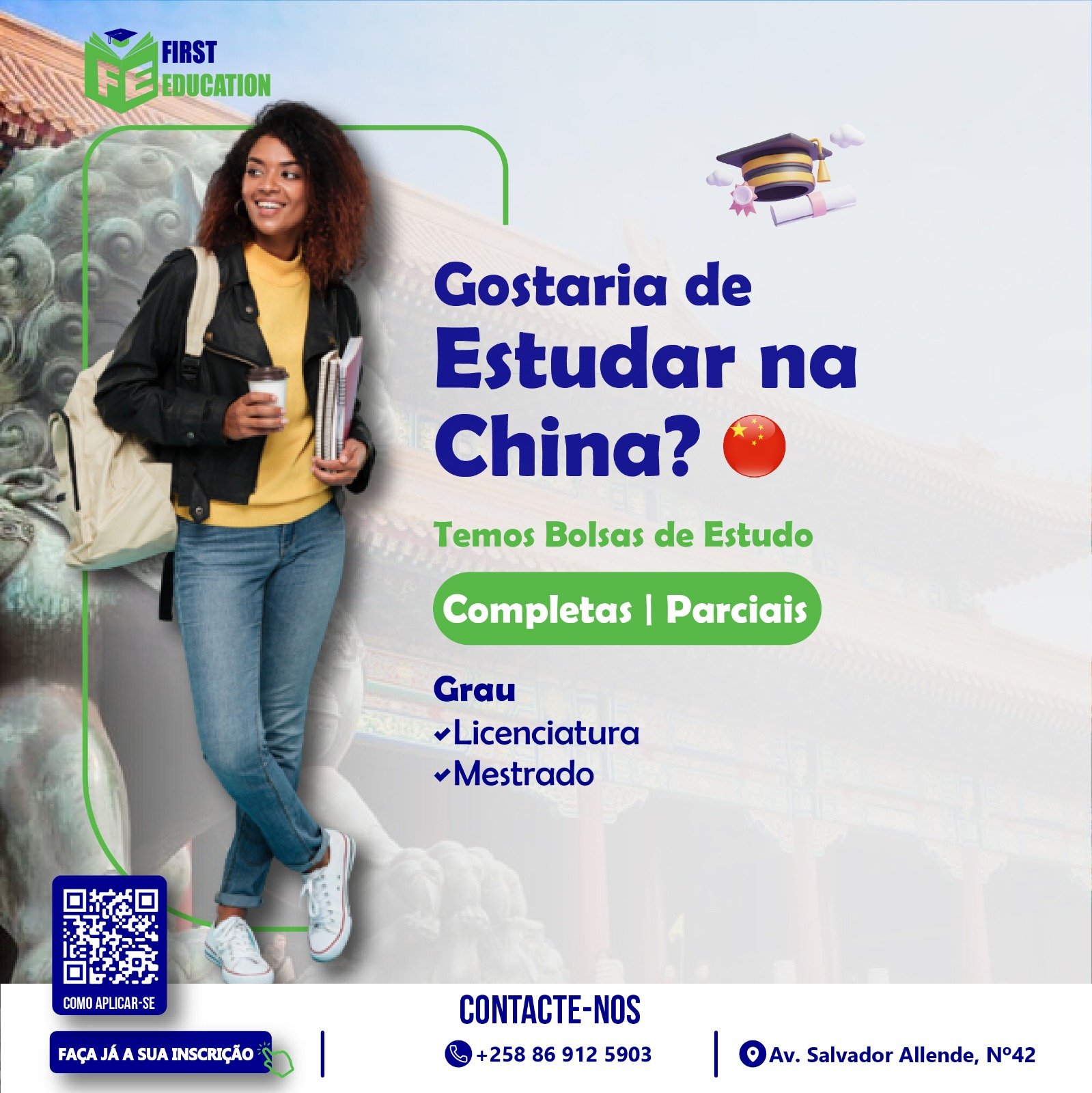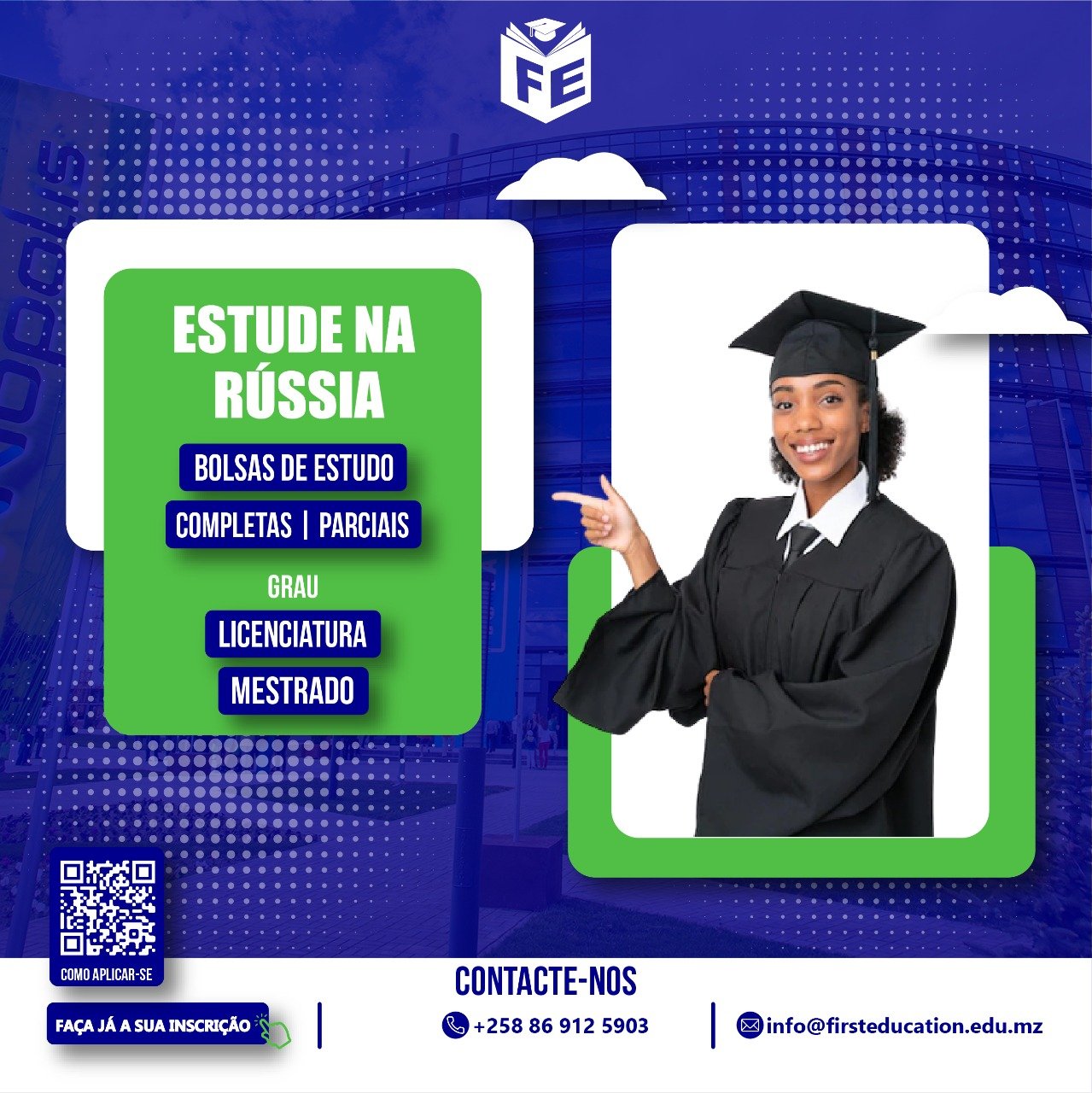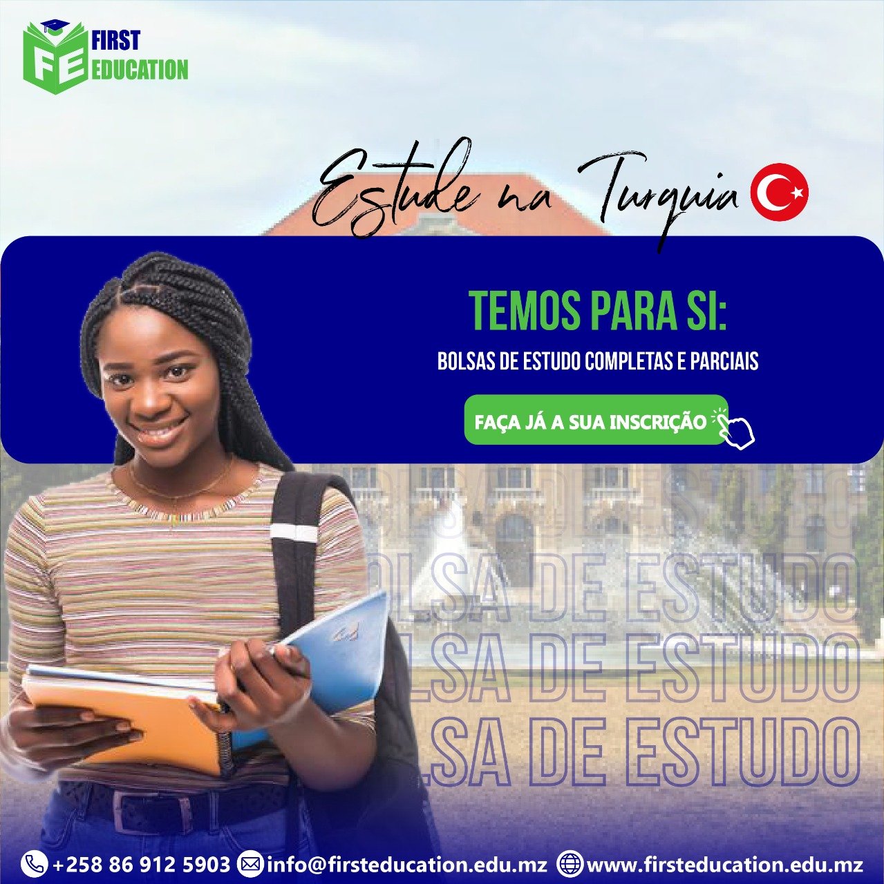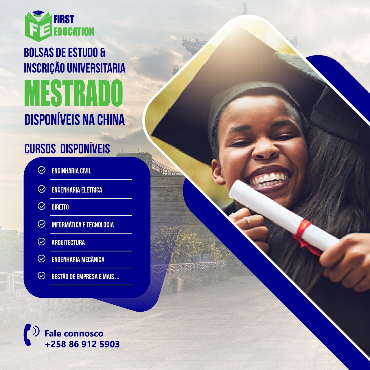 A First Education oferece serviço de Bolsa de estudo, Inscrição universitária, Ano de Fundação e curso on-line. Caso tenha uma dúvida, entre em contacto com o agente para melhor esclarecimento antes de escolher o serviço.